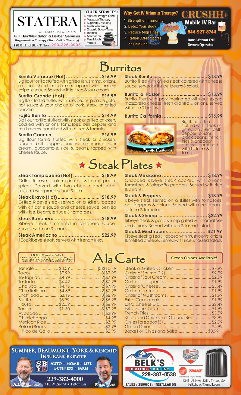 Page 6 | Tifton GAJanuary 29, 2021Written by Chad Roadhouse El Cazador Online Menu – Tifton – Cover | Appetizers | Seafood | Specials & Enchiladas | Fajitas & Chicken | Burritos & Steaks | Drinks | Lunch | Pick 4 & 5 Cover | Appetizers | Seafood | Specials & Enchiladas | Fajitas & Chicken | Burritos & Steaks | Drinks | Lunch | Pick 4 & 5
