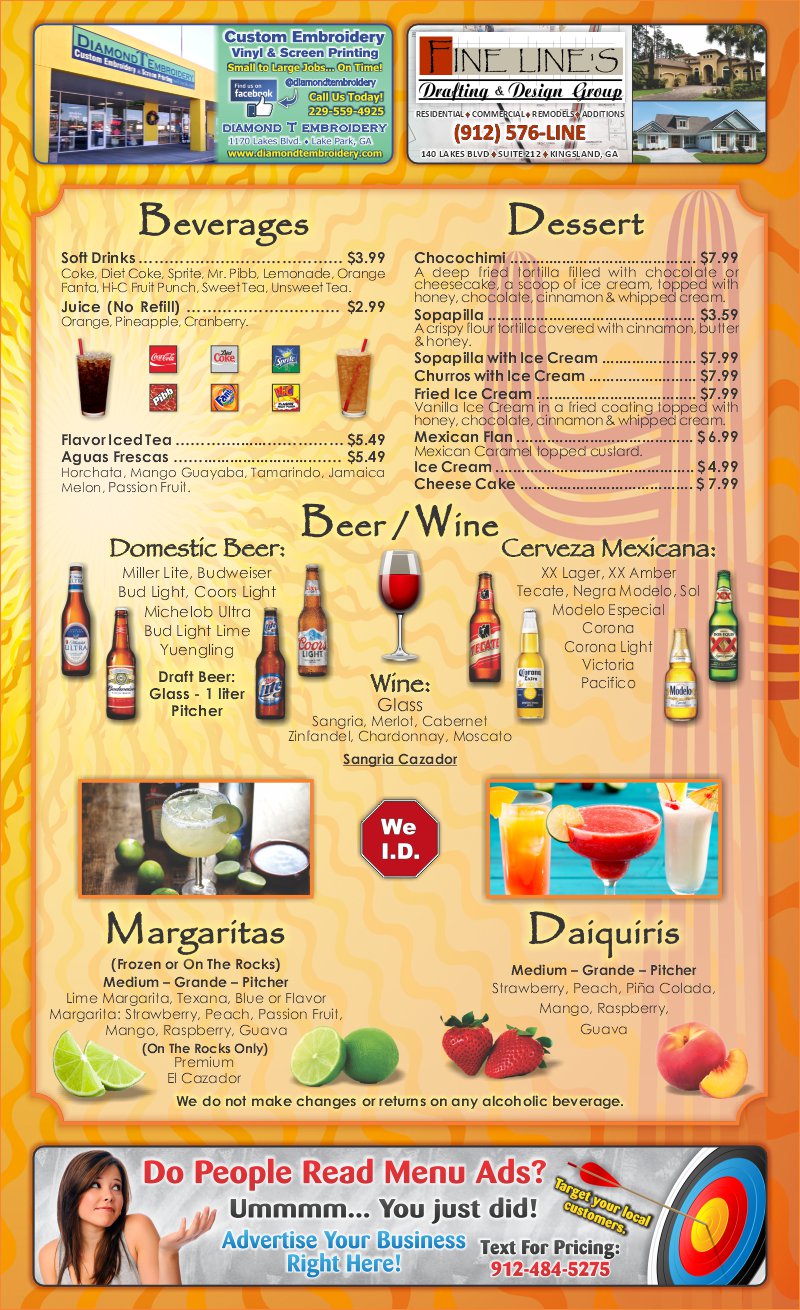 Page 7 | Valdosta GAJanuary 29, 2021Written by Chad Roadhouse El Cazador Online Menu – Valdosta – Cover | Appetizers | Seafood | Specials & Enchiladas | Fajitas & Chicken | Burritos & Steaks | Drinks | Lunch | Pick 4 & 5 Cover | Appetizers | Seafood | Specials & Enchiladas | Fajitas & Chicken | Burritos & Steaks | Drinks | Lunch | Pick 4 & 5